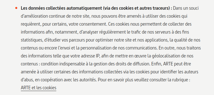 Comme tous les médias, Arte-TV a toujours cherché bien entendu à mettre en avant des contenus vidéos en fonction des profils de groupes d’usagers. Ces groupes sont généralement de taille très restreinte (une famille typiquement) et identifiés par une adresse IP (l’adresse IP externe du routeur LAN/WAN de chaque groupe matérialisé très souvent par une « BidonBox » – remplacez « Bidon » par… « Orange », « Free » ou ce que vous voulez ! bougonna le flic asocial -). Des données horodatées sont collectées et stockées sur le terminal domestique (« un PC ou ce que vous voudrez ! » rebougonna Méndez) dans des fichiers « cookies » à des fins de mesure d’audience, de communication ou de marketing afin de mieux adapter l’offre de contenus pour un groupe d’utilisateurs. Rien de bien neuf là-dedans.