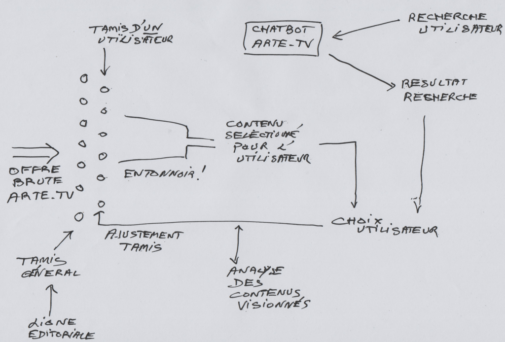 La dynamique est quasi-identique à celle du premier schéma à ceci près que l’utilisateur livre ses recherches de contenus à une entité nébuleuse gérée par Open AI dont le but est de collecter les désirs d’un individu clairement identifié mais aussi de les interpréter et de fournir à l’usager des suggestions de contenus à visionner. L’ajustement du tamis est directement lié aux désirs d’un unique utilisateur suggérés (sussurés à l’oreille droite ?) par notre agent conversationnel ChatGPT-Arte classé (c’est bon pour le marketing et la communication) parmi les logiciels IA.